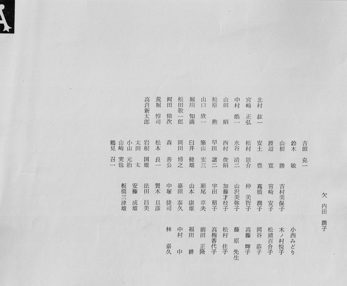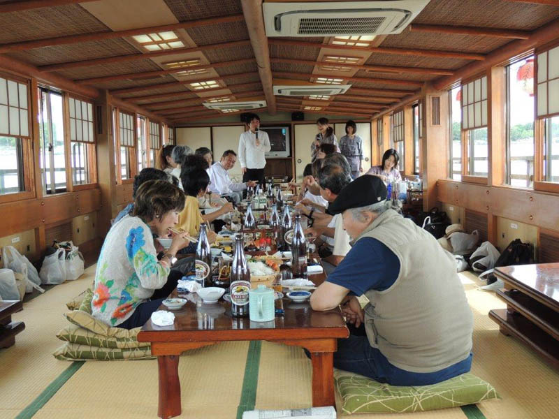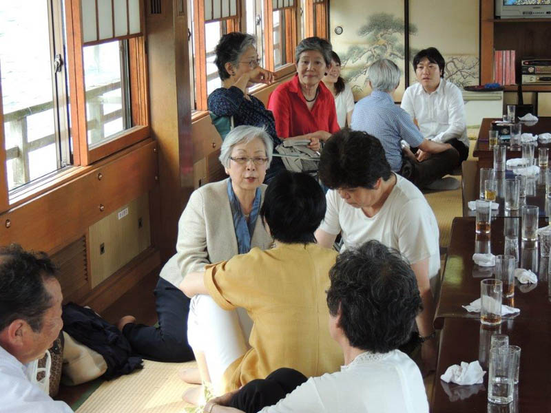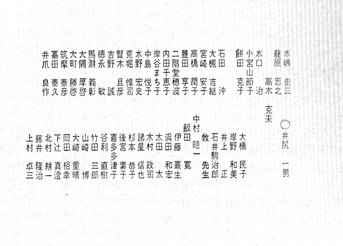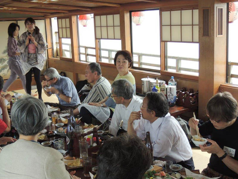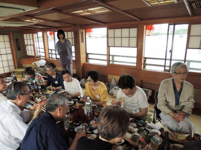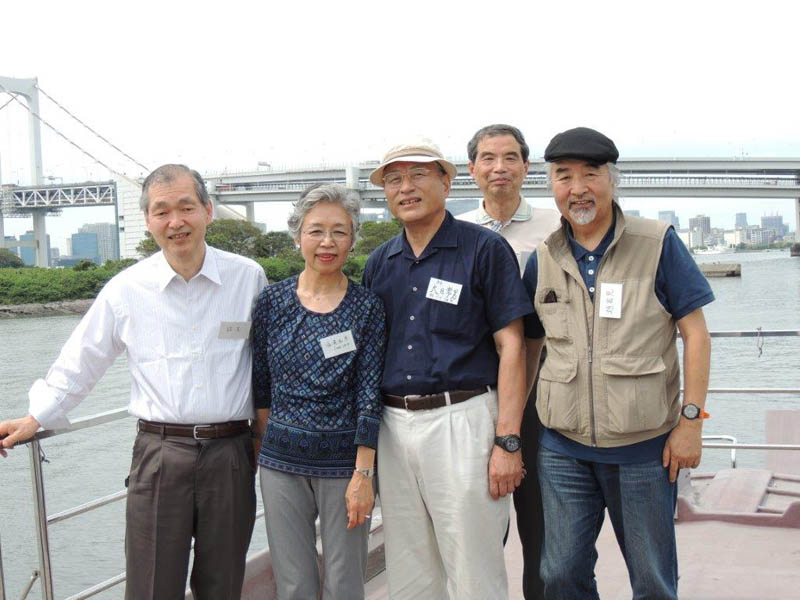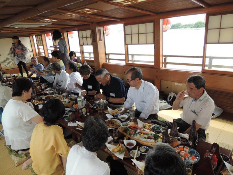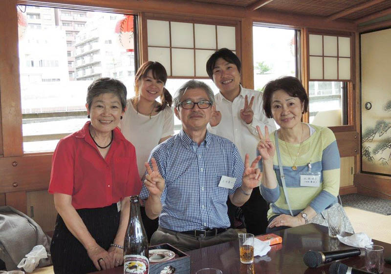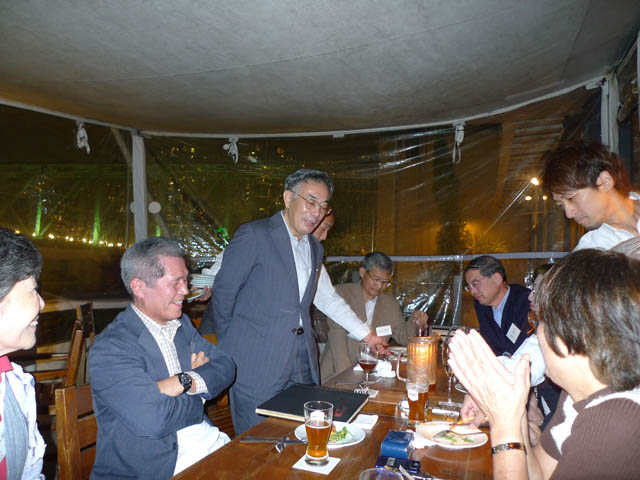 隅田川で屋形船をチャーター。 関西からも参加者があり盛大に開かれました。 最初の集合写真で参加者のお名前は 前列左より 諸星、徳永、北根(粂田)、土井、久世、戸羽(上窪)、宮本(高山)、長尾(浜中)、鈴村(田上)、水口。 後列左より 村田、酒井、泉、平野(喜多)、斉藤(高橋)、大日、矢野(釜田)、趙、浅山(奥)、成瀬 以上20名です。 |