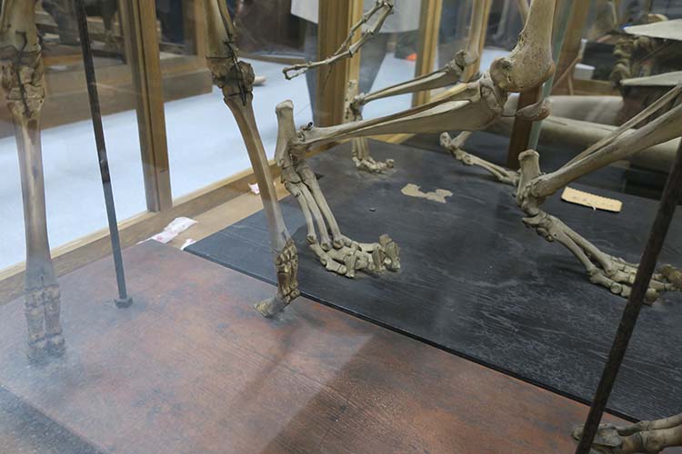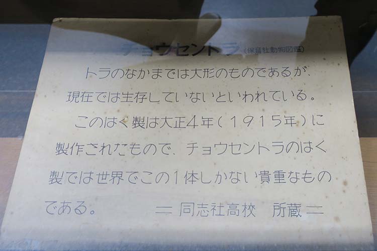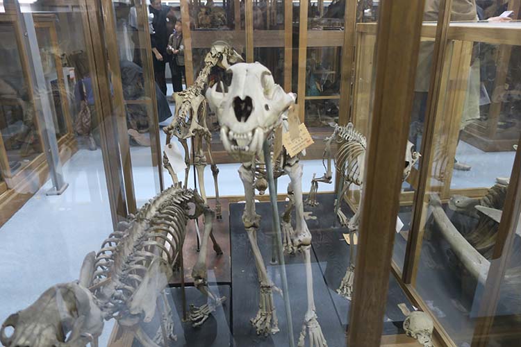 | 吉峰館(キッポウ館)の一角に標本類が置いてあります。50名限定といわれていましたがそれくらい多くの方が集まりました。 チョウセントラの剥製、その他日本犬、蟹、熊、蛇、多くの剥製が山積みです。トラの骨を見ますとくるぶしから先がさらに折れ曲がり高速走行を可能にしています。 | ||