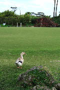 ・・・1罰打で前の位置に戻ってプレー 「5分以内に自分の球であることが確認できない場合は、紛失球となる」規則27−1c 自分の球か同伴競技者の球か、5分以内に識別出来ない場合は、2つとも紛失球となります。その球を打った元の位置に戻って打ち直します。 元の位置がティーインググランド上なら再ティーアップ出来ます。球には必ず印を書いておきましょう。 ☆ パッティンググリーン上で、同伴競技者がパットした球が動いている間に、うっかりして自分の球を打ってしまいました。・・・2罰打でそのままプレー 「他の球がパッティンググリーン上でストロークされて動いている間は、プレーヤーはストロークをしてはならない」規則16−1f 同伴競技者がパッティンググリーン上でパツトした球が動いている間に、自分の球を打つと違反となります。但し、同伴競技者の球より自分の球の方がホールから遠い所にあった時、つまり自分が打つ順番だつた時は無罰です。 パッティンググリーン上以外での、このようなケースは無罰です。 ☆ フェアウェイにあった球を目の前で、カラスがくわえて持っていってしまった。・・・無罰で球のあったと思われる地点にリプレースしてプレー。 りプレースする位置が不確かな場合はドロップする。 「止まっている球が局外者により動かされても罰はなく、その球はリプレースされなければならない」規則18−1 カラスは局外者となります。このケースでは、カラスが持ち去ったことをハッキリと確認出来ているので無罰です。 別の例で、あるはずの球を探したが見つからず、近くにいたカラスが球をくわえていたので、あの球がそうだろうという場合は適用されません。 ハッキリと確認出来ていない場合は、紛失球となり1罰打で前の位置に戻ってプレーします。 ☆ ウォーターハザード内の橋の上にボールが止まり、その球をソールして打った。・・・無罰 「そのハザード内の地面やそのウォーターハザード内の水に自分の手やクラブで触れることは禁止行為」規則13−4b ウォーターハザードの区域の限界は、垂直に上下にも及びます。したがって、その区域内にある橋の上もウォーターハザード内となります。 しかし、規則が禁じているのはクラブが地面か水に触れることなので、違反とはなりません。同様に、草に触れても違反になりません。 そのまま打てない場合は、橋は「動かせない障害物」ですが、ハザード内にある場合は救済が受けられないので、1罰打でウォーター ハザードの処置をとります。 |