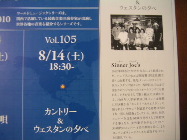 7月21日(祝日)、同志社新島会館でのOG、OBによるライブコンサートのお知らせです。 私は同志社OBで構成する「シナージョーズ」というカントリーバンドで出演します。 PDFになっておりますのでここからご覧ください (498KB) 10月の丸山音楽堂の「カントリードリーム」はチラシができ次第あらためてご案内します。 |